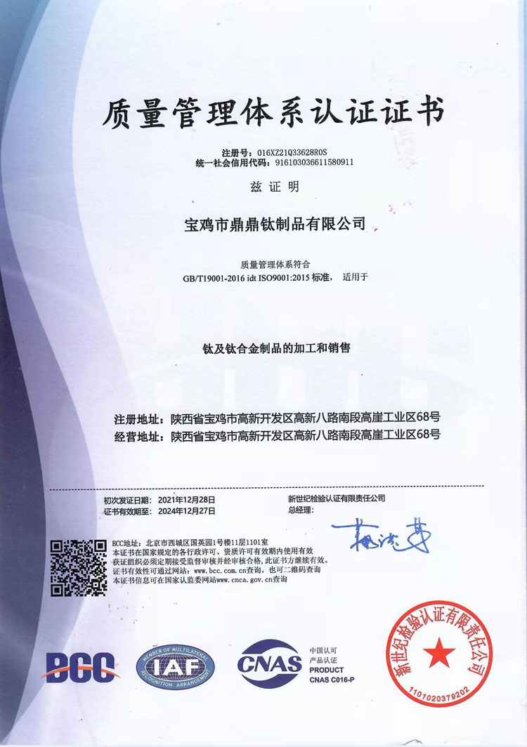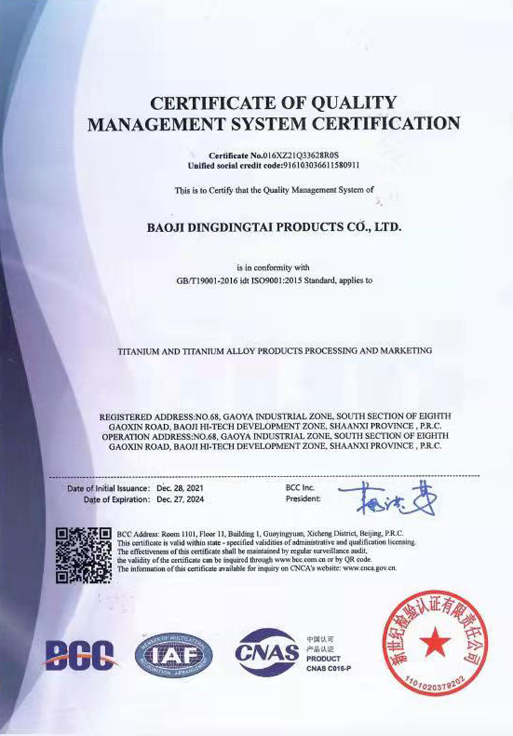 3、 Quality System Certification: Standardized Management Throughout the Entire Process We build a quality management system based on international standards, achieving standardized control of the entire process from research and development, production to service, and providing institutional guarantees for stable quality. - ISO 9001:2015 Quality Management System Certification: Covering the entire production chain of titanium alloys, ensuring that every operation has standards to follow and records to check. - ISO 9001:2015 Quality Management System Certification: Covering the entire production chain of titanium alloys, ensuring that every operation has standards to follow and records to check. - GJB 9001C-2017 Weapon and Equipment Quality Management System Certification: Adapting to the needs of military and aerospace industries, achieving military grade quality control. Quality commitment: Each batch of products is delivered with a third-party authoritative testing report and our own laboratory testing records, achieving "dual verification and full traceability". If the customer has any questions about the test results, we will unconditionally cooperate with the re inspection to ensure that every trust has a solid basis.