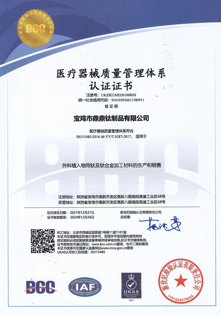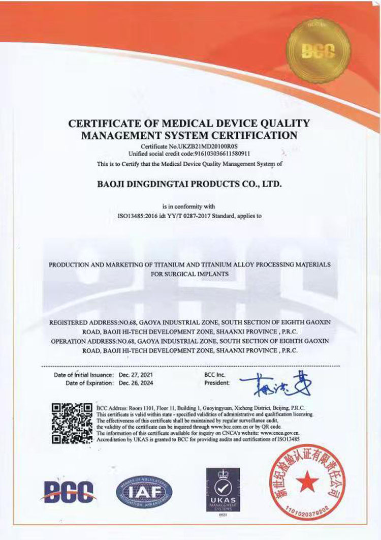System Certification: With authoritative testing, we forge the cornerstone of quality The quality of titanium alloy materials is related to the safety and performance of downstream equipment. Dingding Titanium Industry always integrates "comprehensive quality control" throughout the entire production process, building a dual testing system of "third-party authoritative endorsement+self owned laboratory precise control". From raw material entry to finished product delivery, every indicator can withstand rigorous inspection, providing customers with reliable product guarantee. 1、 Third party authoritative testing: Industry benchmark as quality testimony We are well aware that neutral authoritative testing is proof of the core quality. Each batch of titanium alloy products is entrusted to two authoritative testing institutions in the industry for comprehensive re inspection. The testing report has global recognition and directly supports core customer requirements such as product registration and project acceptance. Baotai Group Experimental Center As a professional testing institution in the domestic titanium industry, Baotai Group Experimental Center has nationally recognized qualifications, and its testing results are professional tests recognized by the titanium alloy material industry. Our products undergo comprehensive testing, including component analysis, mechanical properties, and corrosion testing, to ensure compliance with various rigorous standards such as national military standards, medical standards, and aerospace standards. Northwest Nonferrous Metals Institute Han Tang Testing Center Based on the technological accumulation of Northwest Nonferrous Metals Research Institute, Hantang Testing Center has professional advantages in the field of titanium alloy micro analysis and impurity element detection and analysis of heavy metals. Our high-end titanium materials undergo precise testing, including metallographic structure analysis, mechanical property analysis, and chemical composition analysis, to eliminate any microscopic defects and ensure stable product performance.