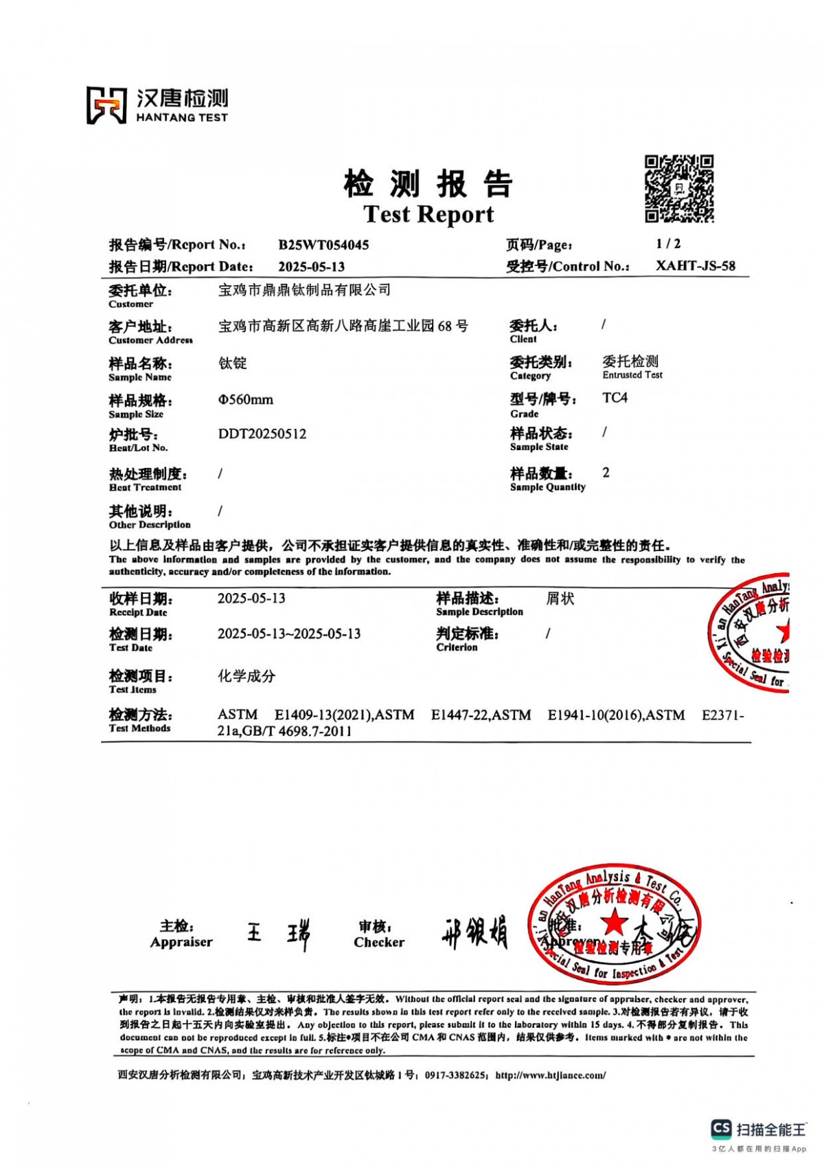 Test report of medical φ 16 titanium rod