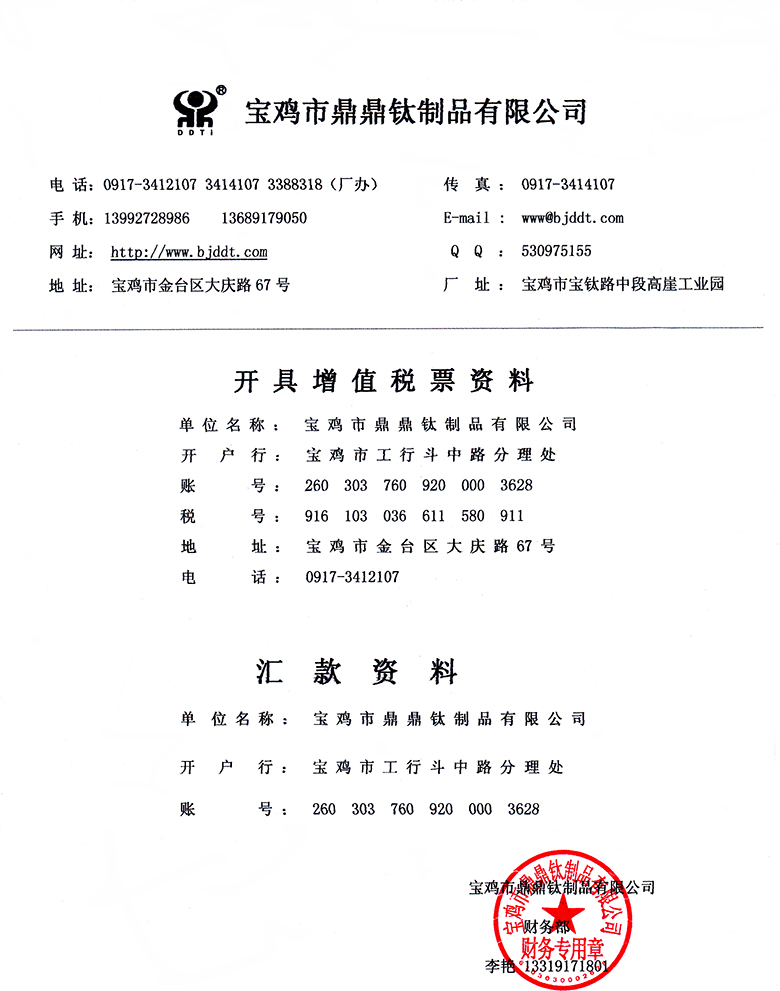 Contact UsAddress:No. 68, Gaoya Industrial Park, Baoti Road, Gaoxin Eighth Road, High tech Zone, Baoji City (Map navigation search for Baoji Dingding Titanium Products Company)Sales Call:+86-917-3412107 3414107For major clients, please dial:+86-18091715917Foreign trade email:www@bjddt.com sales@bjddt.comMonday to Friday:8:00-18:00Saturday: 9:00-15:00(except holidays) |