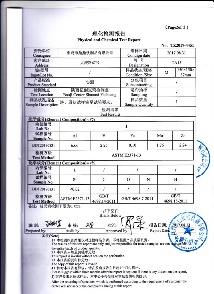 Test report of medical φ 16 titanium rod |