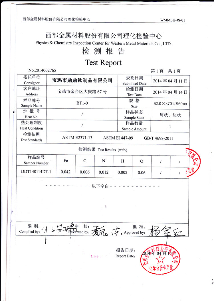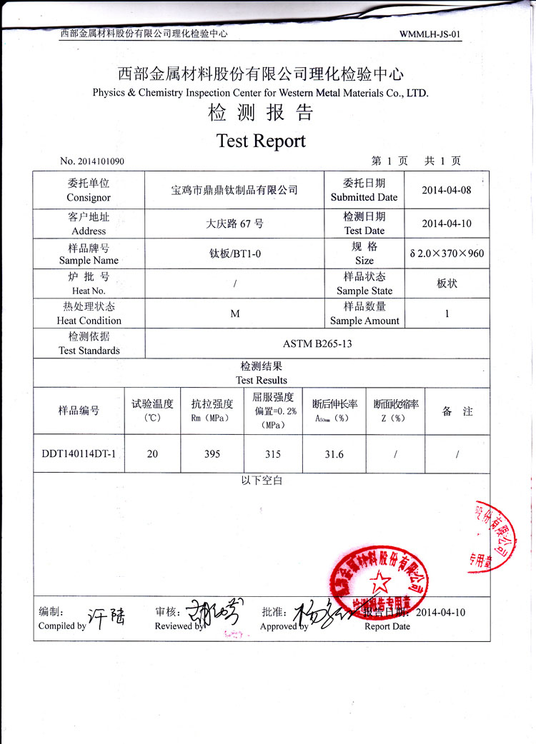 Test report of bt1-0 titanium plate 2.0 exported to Russia |