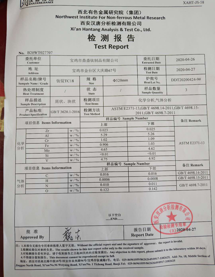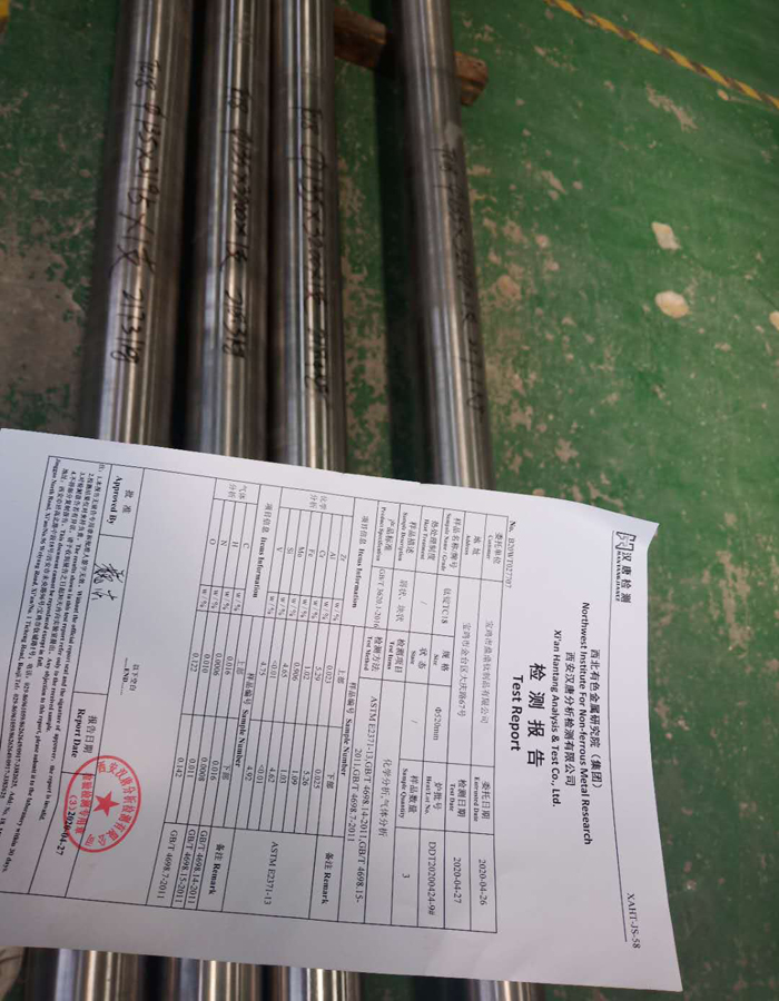TC18钛合金石油仪器棒出货:φ135*3200 4支,合计:871kg 出货中,材质报告如下表: