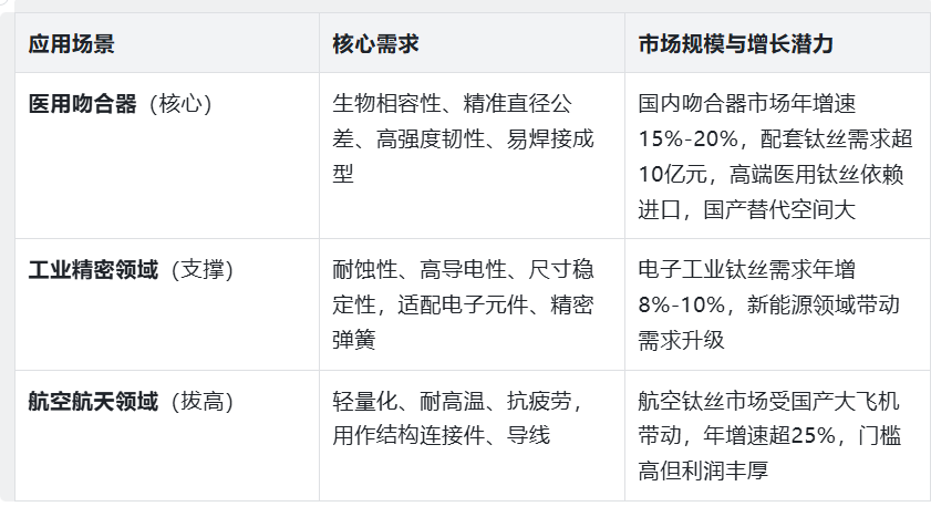 支持根据客户需求定制特殊直径、表面处理(如电解抛光)及包装方式,标准化产品交付周期低至 7 天。 3. 应用价值体现 - 对医疗器械企业:高一致性的尺寸精度可降低吻合钉加工报废率,医用级资质与完整检测报告缩短产品注册周期,较进口钛丝价格低20%-30%,显著提升成本优势。 - 对医疗机构:钛丝制成的吻合钉组织相容性好,术后感染率降低60%,且无磁性不影响术后MRI复查,为医生提供精准缝合保障。 - 对患者:减少术后排异反应与疼痛,吻合口愈合时间缩短3-5天,降低二次治疗风险,提升手术体验与康复效果。 二、主力产品:其他常见用途钛丝 依托成熟的钛丝生产工艺,我司同步打造多元化产品系列,满足不同领域对钛丝“耐蚀、轻质、高强度”的核心需求,实现“一厂多能”的供应保障。 1. 工业精密钛丝(TA1/TA2牌号) 针对电子、新能源、化工等领域的精密部件需求,采用自动化连轧生产线加工,确保尺寸稳定性与批次一致性,耐蚀性达5000小时盐雾无锈斑,是传统不锈钢丝的理想替代材料。